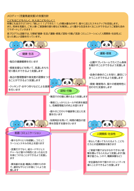 放課後等デイサービス・児童発達支援 メロディーでは、5領域「健康・生活」「運動・感覚」「認知・行動」「言語・コミュニケーション」「人間関係・社会性」をふまえた総合的な支援を行うとともに、支援の見える化を目的として、5領域との関係性を明確に示した支援プログラムを公表しております。